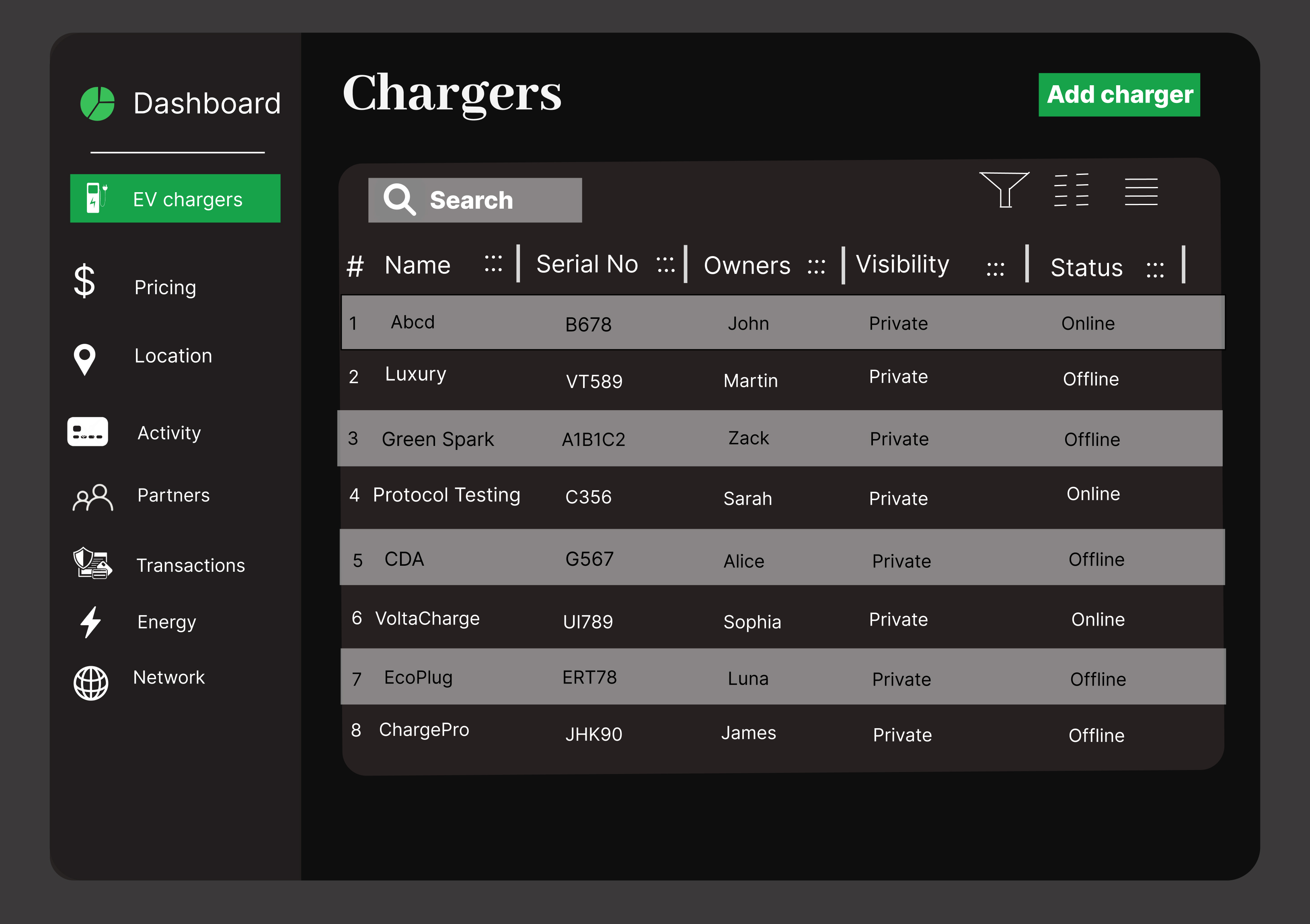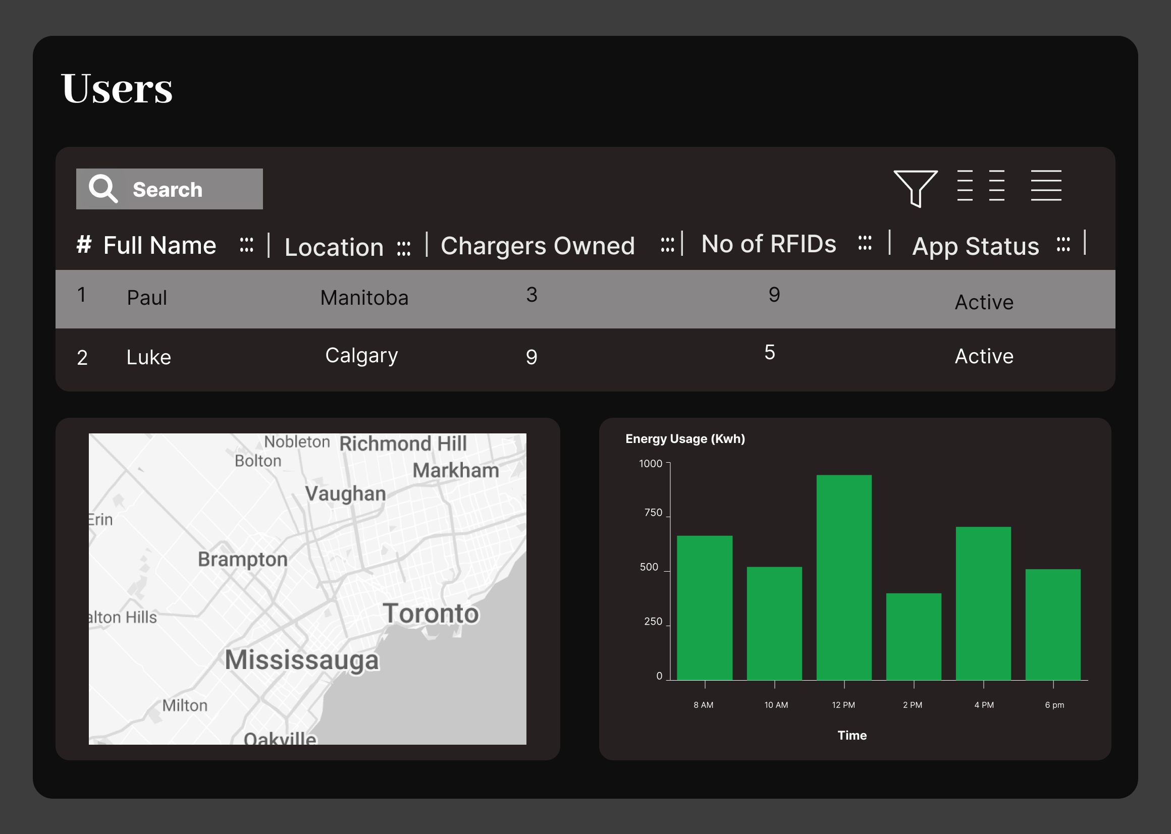 Our solution provides live tracking of charging status, availability, usage and map of locations.